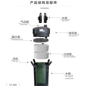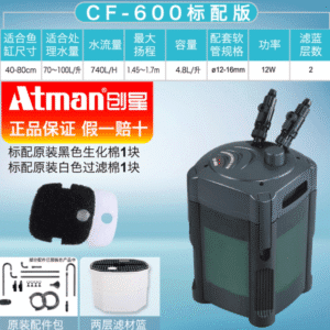 | CF-600 | 40–80cm freshwater tank | 70–100L | 740L/H | 4.8L | 2 | 12W |