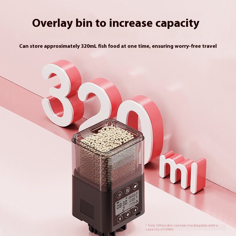 It has an extra – large capacity with overlay bins, capable of storing up to 320ml fish food to meet long – term feeding needs.